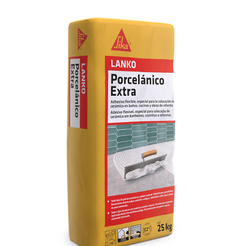 LANKO® Porcelanico Extra es un adhesivo cementoso para el pegado de baldosas en suelos para interiores y exteriores y para pegado de baldosas en revestimientos interiores. Especialmente para baldosas de muy baja absorción como gres porcelánico.