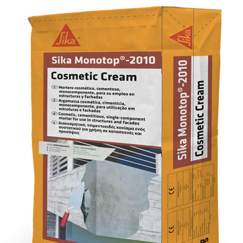 Sika MonoTop®-2010 Cosmetic Cream es un mortero cosmético para su empleo en estructuras y fachadas, que cumple los parámetros de las normas UNE-1504-3 y 998-1, formulado siguiendo criterios de sostenibilidad lo que permite la reducción del empleo de cemento y aditivos generando una menor huella de carbono.