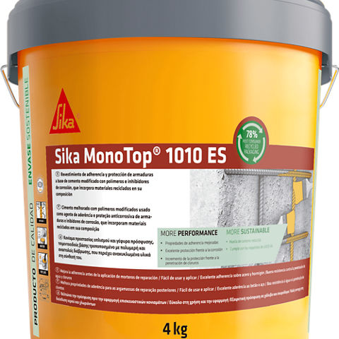 Sika MonoTop®-1010 ES es un pasivador de armaduras, cementoso, mocomponente, modificado con polímeros. Se utiliza como imprimación de adherencia y como protección anticorrosión de la armadura previo al empleo de morteros de reparación. Contiene inhibidores de corrosión y materias primas recicladas en su composición, lo que supone una menor huella de carbono frente a un mortero de iguales prestaciones. Se comercializa en un envase fabricado con materiales reciclados en su composición.